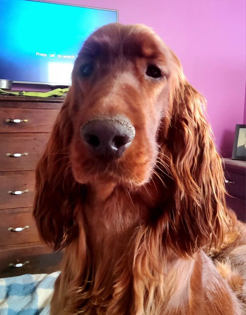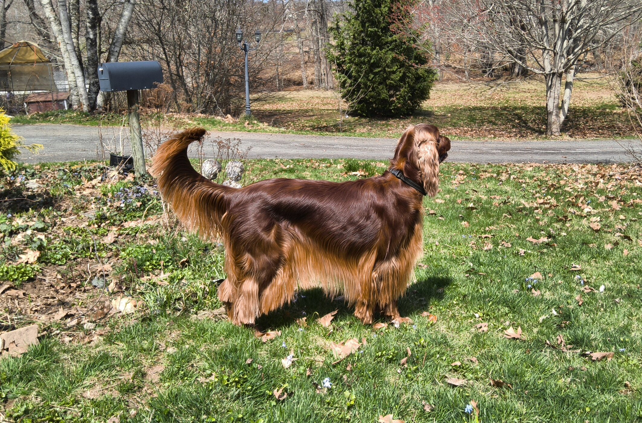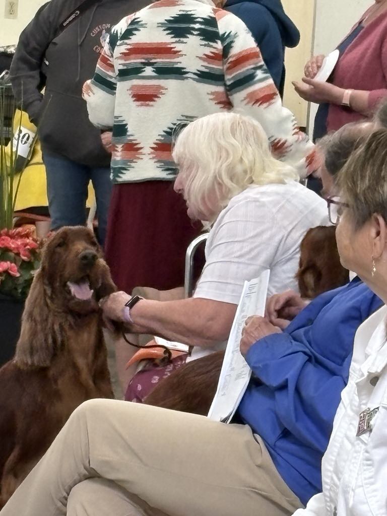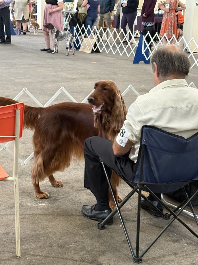 Emma (Mythen's It's All Aboout the Emerald Isle) is the puppy we chose to keep from Whimsy's April 1, 2022 litter. Primarily chosen for her temperament, intelligence and lovely topline, we felt that she wouldn't disappoint us in the show ring. We were correct. She earned her Championship very quickly with 3 Best of Breeds, 1 Best of Winners and a Best of Opposite Sex. She has a nice strong front, lovely long neck, great topline and strong rear assembly. Like her mother, she has shown us an excellent range of motion as well as a keen interest in birds and scent detection. She has a strong personality - just adores meeting people for a cuddle or two. If she sees an animal on the TV she cries quietly like she wants to meet them..